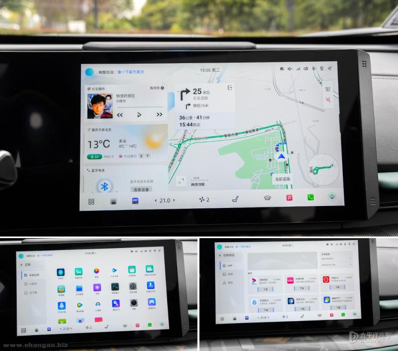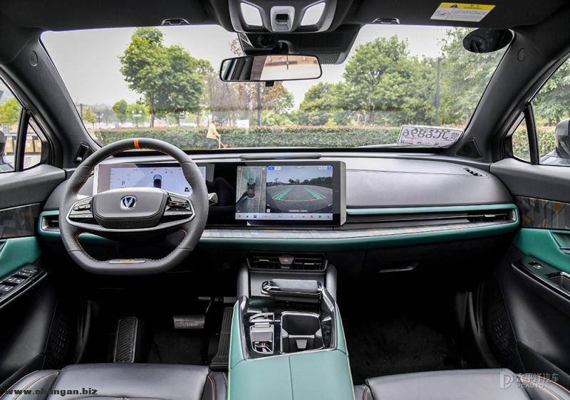12.3+12.8 英寸的懸浮式雙聯屏,搭載 " 互動港灣 " 一體式彎連屏,長安全新域控平臺 CIIA1.0+,可實現下電后 OTA 升級,并具備智能電源管理自動預警,車輛診斷支持故障自診斷和遠程診斷等功能。高通驍龍 8155 車規級芯片每秒運算可達 8 萬億次,可實現高算力 3D 實時渲染,并且還使用了更加簡潔化的全新 UI。